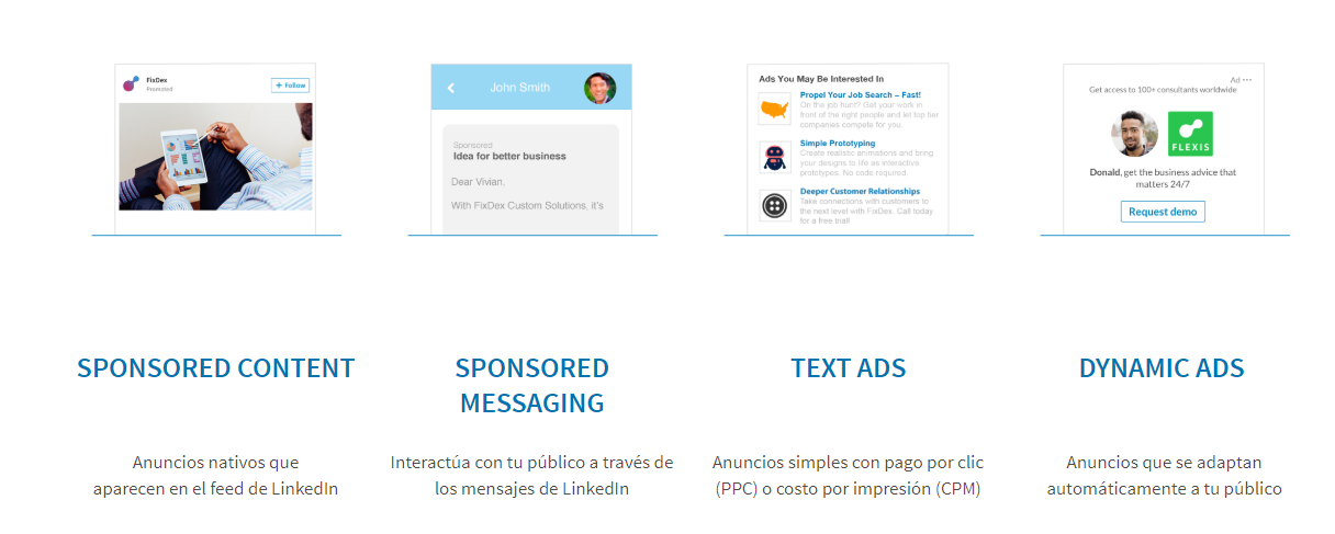 - Dynamics Ads: se adaptan automáticamente a tu público objetivo. Son anuncios personalizados para cada usuario en función de la información de su perfil de LinkedIn.