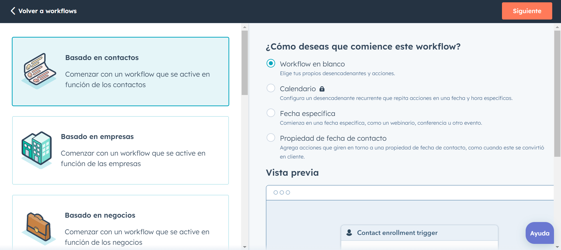 Entonces, se va a abrir una pantalla donde aparecerán distintas opciones de workflows. Las cuatro primeras son las más comunes y se aplican a los tipos de registros principales de la plataforma (contactos, empresas, negocios y tickets). Estas opciones lo que identifican es el tipo de registro que se utilizará como base para la ejecución de las acciones..png?width=1920&height=858&name=Captura%20de%20pantalla%20(145).png)