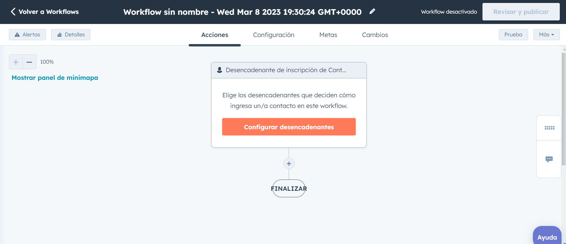 Luego, podemos pasar a la pestaña Configuración, en donde podremos determinar la temporalidad del workflow, para el caso que queramos que esté activo solo en ciertos momentos del día. Es un sistema muy útil para poder enlazar con campañas, con promociones y demás momentos que requieren ciertas modificaciones en un cierto lapso de tiempo.