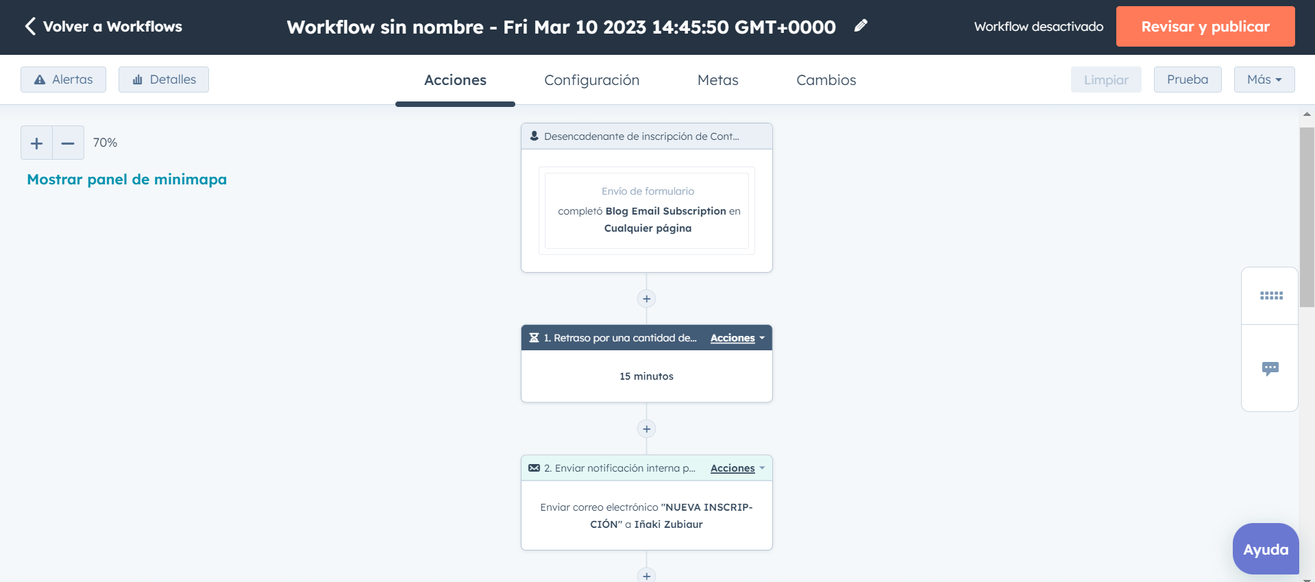 Luego de establecer el desencadenante, debemos inscribir la acción a tomar haciendo clic en el signo más. Puede ser desde enviar un correo interno a una persona del equipo hasta la creación de una solución ramificada (si ocurre X cosa, que pase tal otra), normalmente conocidas como “If/Then”. En particular se puede agregar: retrasos temporales de la acción, envíos de notificaciones internas, mails y mensajes al contacto, la creación de información (tareas, fichas de contacto, etcétera), la inscripción del contacto en cierta lista, la edición de propiedades del contacto y mucho más.