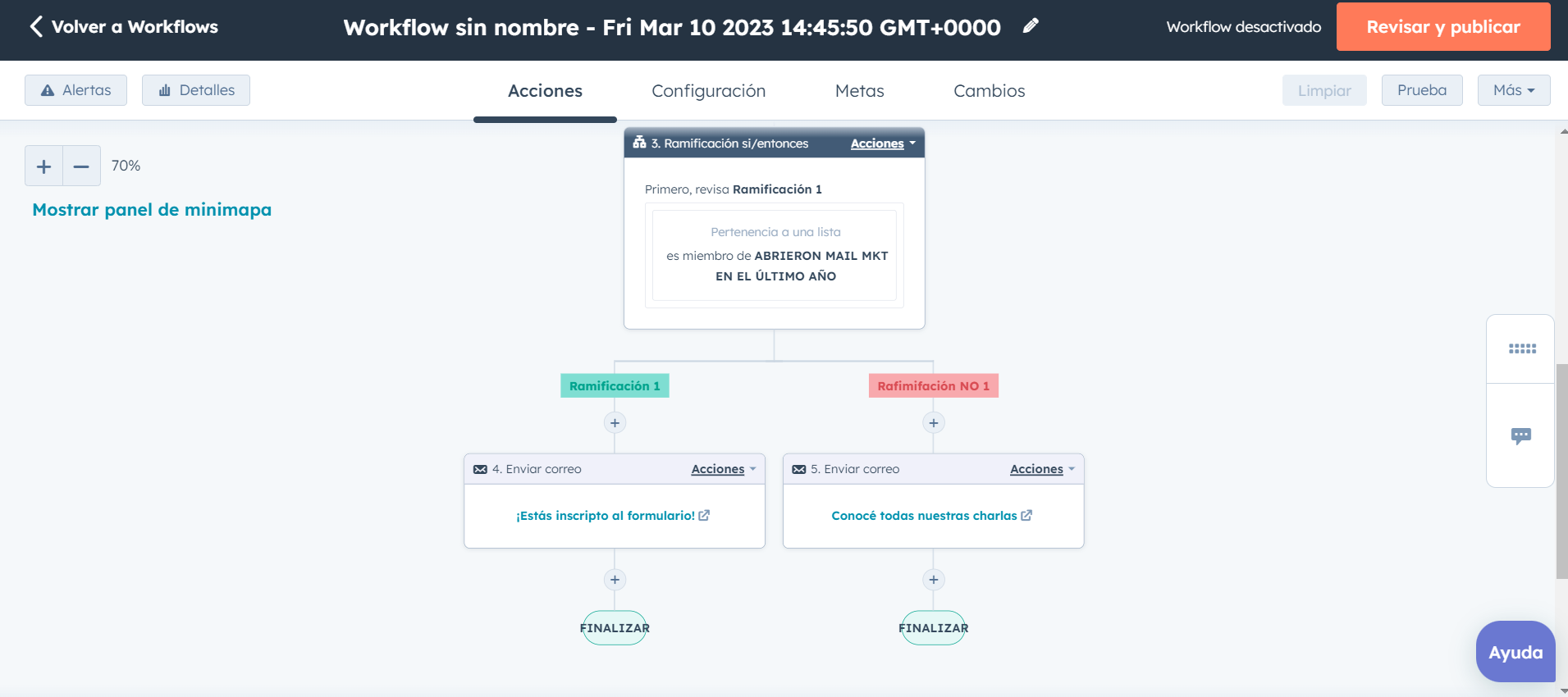 Después podemos establecer otra acción. Por ejemplo, si antes pusimos una orden para que al contacto se lo sume a una de las listas del CRM, ahora podremos poner una acción para notificar a una persona del equipo de ventas. Luego, una ramificación “sí/entonces” (if/then), en la que se establezca que, si el contacto formaba parte de cierta lista, se le envíe determinado mail y, si no era el caso, otro tipo de correo.
