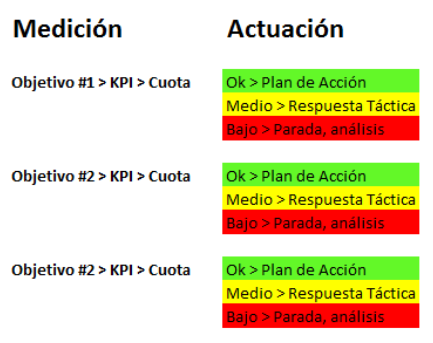 El cuadro de mando será el resumen de cada uno de los objetivos, ordenado por importancia (representada con un porcentaje de cuota). Una técnica adecuada para mostrar visualmente el alcance de cada objetivo durante el proceso es la técnica del semáforo. En ella, por cada objetivo se establece: