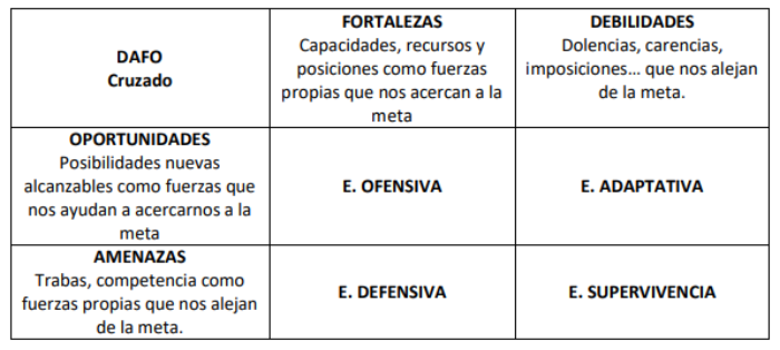 Partiendo de nuestro DAFO inicial podemos elaborar un DAFO cruzado que nos ayudará a establecer las estrategias, empezando por las ofensivas, continuando por las adaptativas y de supervivencia, y acabando por las defensivas.