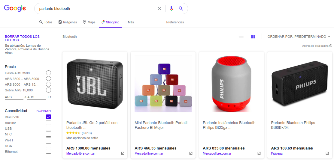 En Google Shopping introducís el producto que estás buscando (por ejemplo, “parlante bluetooth”) y obtenés una lista de resultados que podés reordenar y filtrar según rango de precio, marca, modelo o diferentes características.