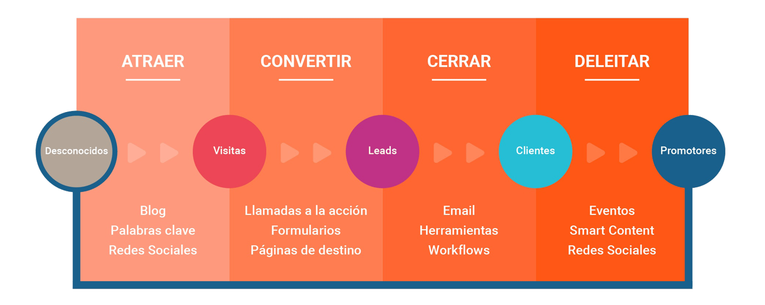 El proceso de inbound tiene cuatro grandes etapas. Su objetivo es atraer a más clientes potenciales; convertirlos en leads; nutrirlos hasta cerrar una operación de venta; y deleitarlos para que se conviertan en embajadores de tu marca. Este es el corazón de la metodología.